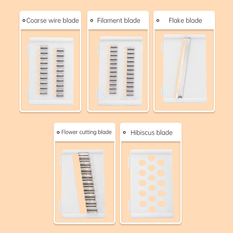 - Function: 1.Cut thin slices 2.Cut thick slices 3.Cut flower slices 4.Cut fine shreds 5.Cut thick shreds 6.Grind garlic and ginger 7.Separate egg yolk and egg whites 8.Store vegetables 9.Wash vegetables and drain 10.Scoop water 11.Safety hand guards