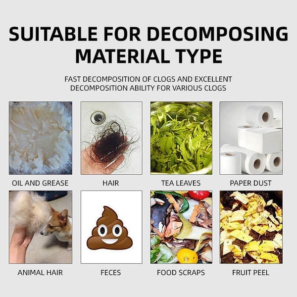 It liquefies grease, oil, lint, paper, hair and other organic matter blocking the drain.