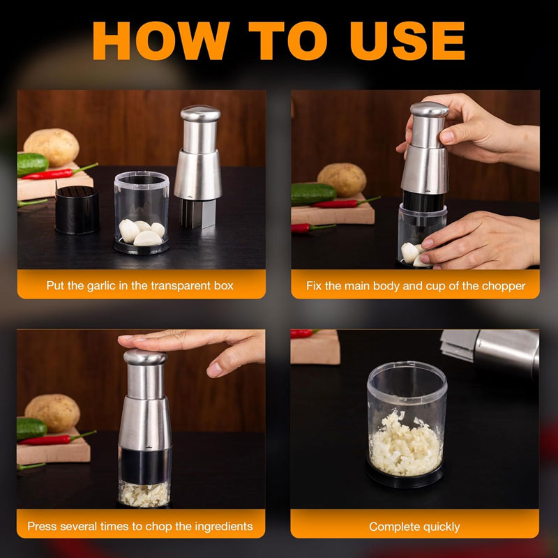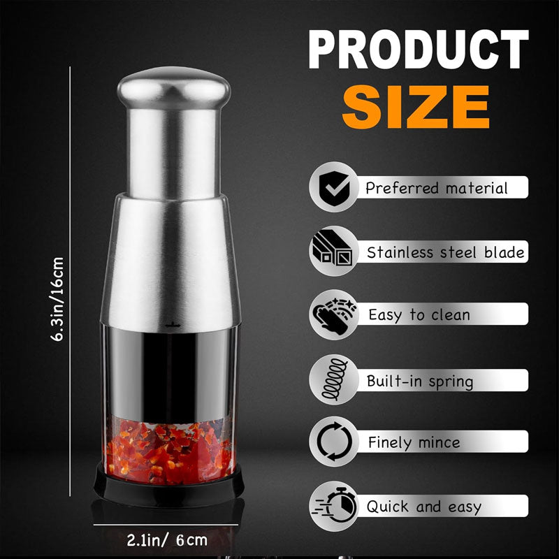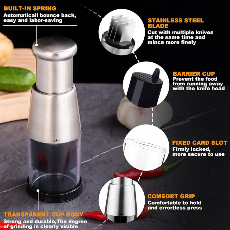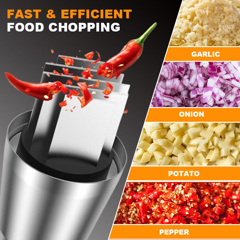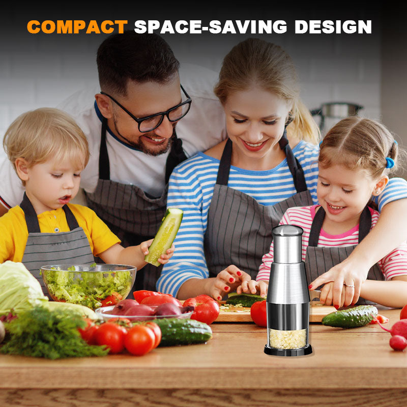 - Simply press the top, and multiple sharp blades instantly chop vegetables, nuts, garlic, chili peppers, and more!